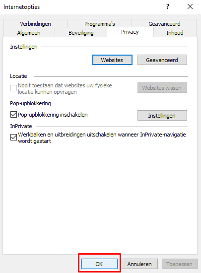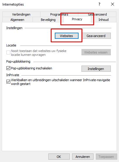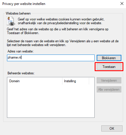 Vanwege veiligheidsoverwegingen is het niet mogelijk om in te loggen op pharme.nl wanneer uw internet browser het gebruik van cookies niet toestaat. Indien uw browser geen cookies accepteert, kunt u een uitzondering maken voor onze website door onderstaande stappen te volgen. Let op: deze stappen gelden voor de browser 'Internet Explorer'. Maakt u gebruik van een andere browser of komt u er niet uit? Neem dan contact op met uw systeembeheerder.